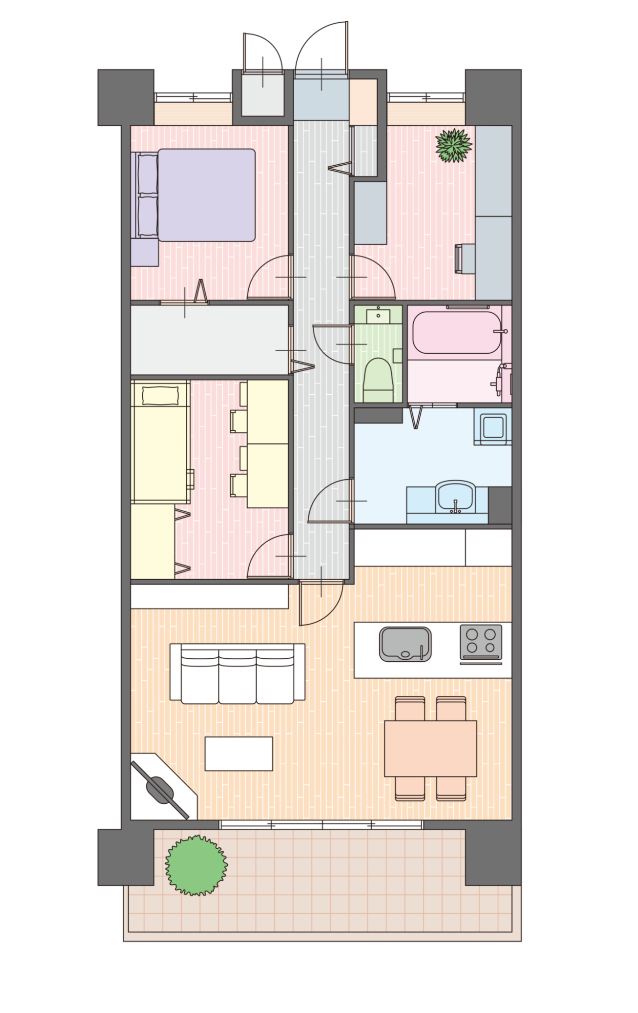 70㎡超の3LDKなら、リビング・ダイニングに十分な広さを確保しつつ、夫婦の主寝室と子ども達それぞれの個室も実現できます。