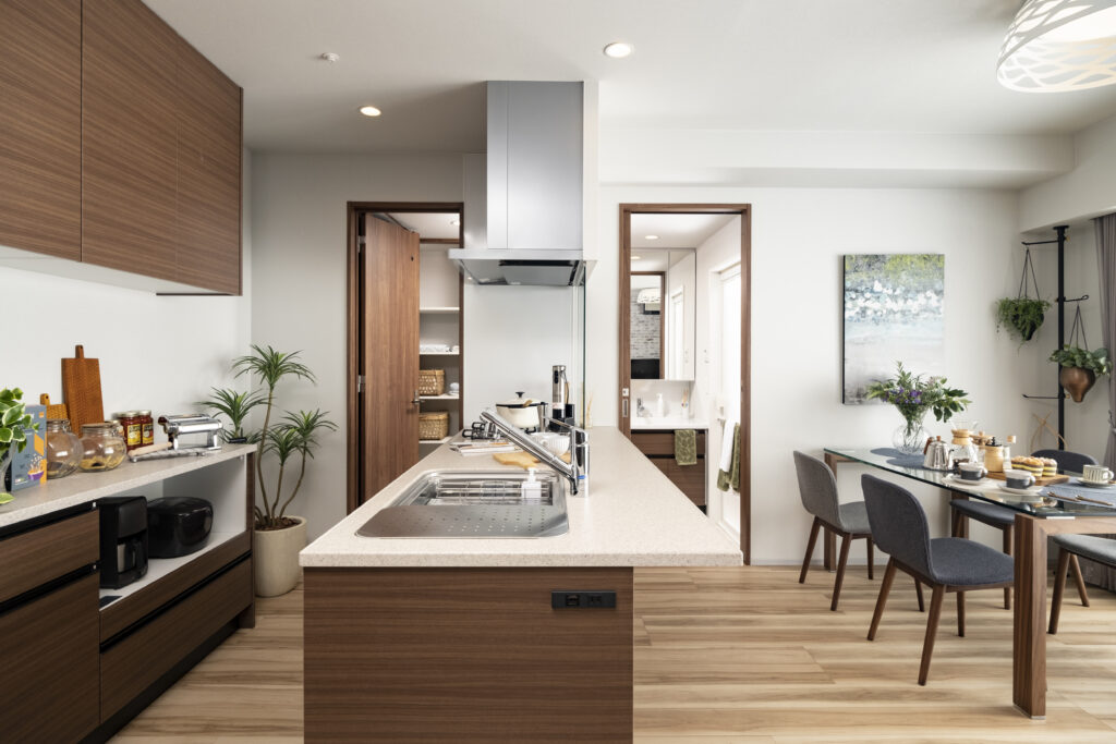 キッチンの扉やダイニングテーブルの脚、建具の色や柄を統一すると、まとまりのある空間に仕上がります。
