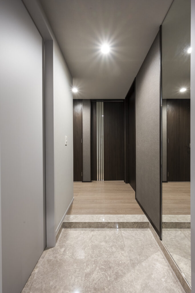 右手に取り付けられた大きな鏡では、外出前の身だしなみチェックはもちろん、玄関スペースをより広く感じる嬉しい効果も。