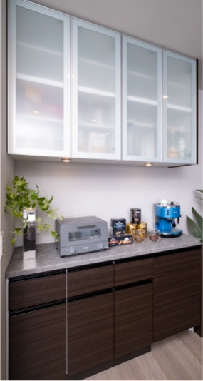 食器や調理器具を収納するキッチンキャビネットです。キッチンの収納スペースを増やし、整理整頓に便利です。